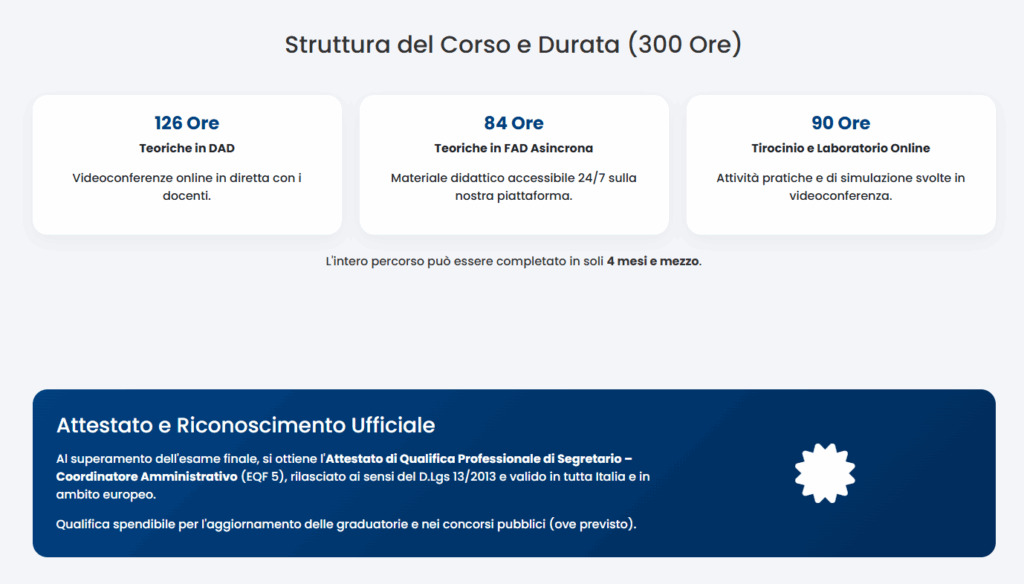 Il Corso avrà una durata di 300 ore da svolgere interamente ONLINE come di seguito articolato: