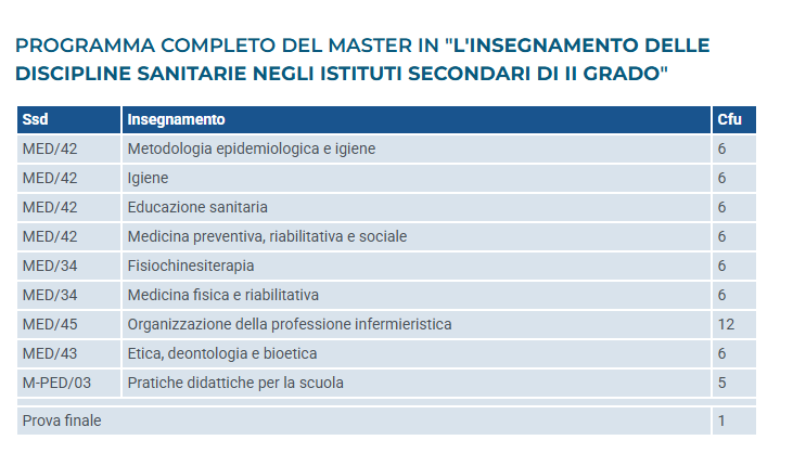 A seguito degli esami finali del Master viene rilasciato il “Diploma di Master Universitario” annuale di I livello: “L’insegnamento delle discipline sanitarie negli istituti secondari di II grado” di 1500 ore e 60 CFU.